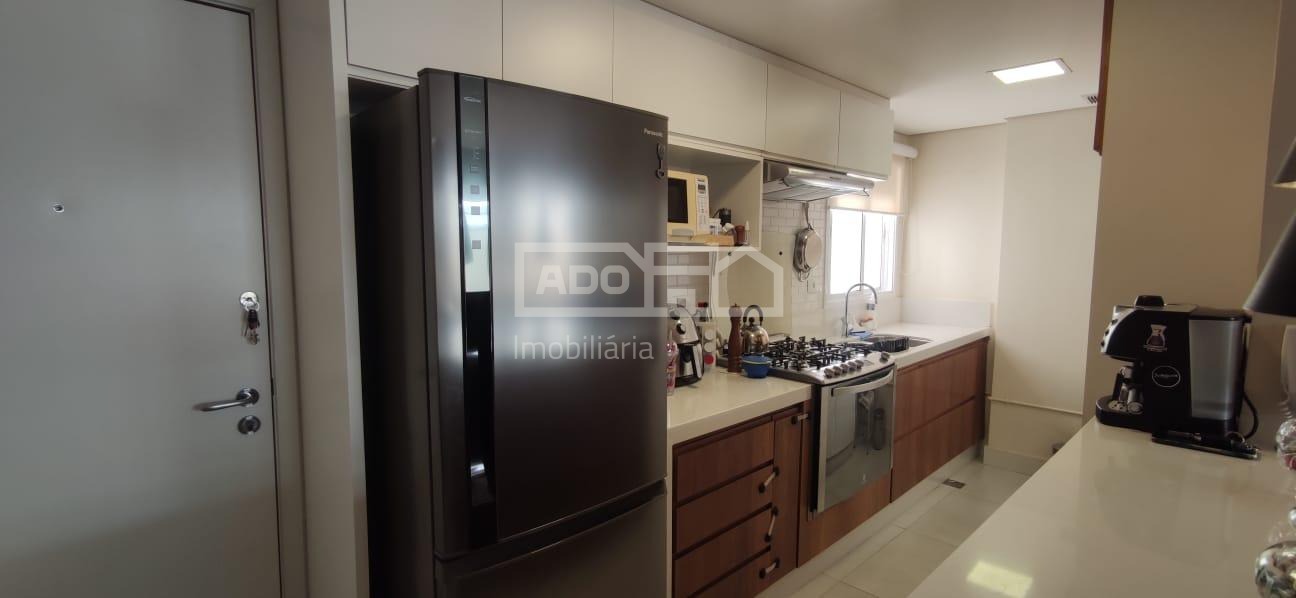 Granito na sala e corredor, porcelanato na cozinha e varanda, piso laminado nos quartos.