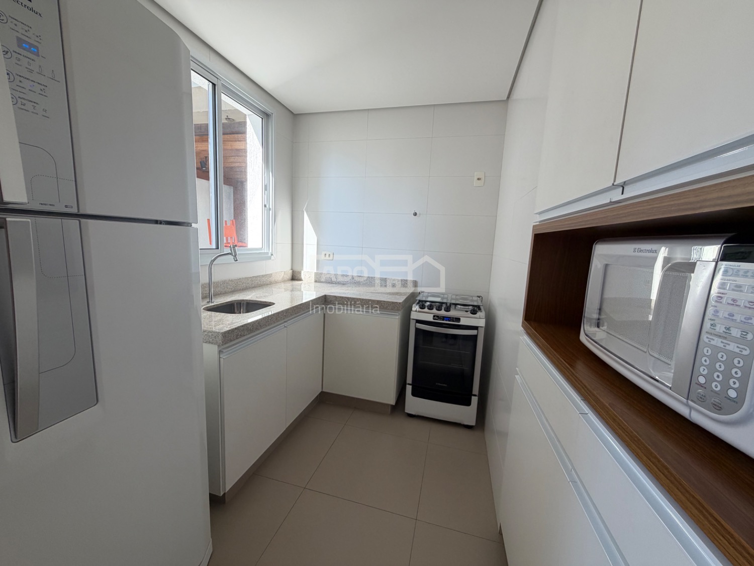 * cozinha planejada de armários com fogão/geladeira/micro-ondas