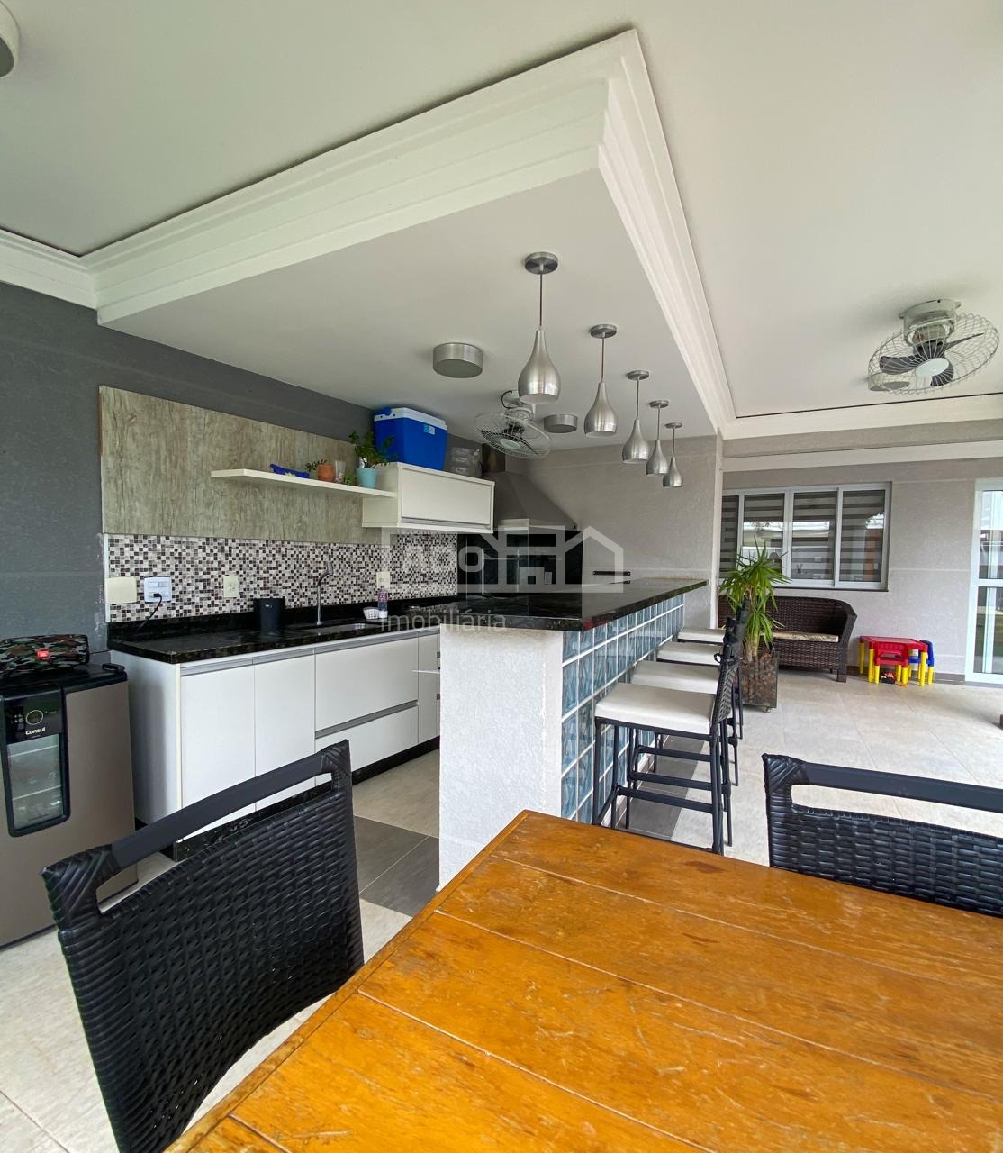 No 2o pavimento tem 3 suítes e 3o sala de cinema e vinhos com adega. 2 grandes sacadas.