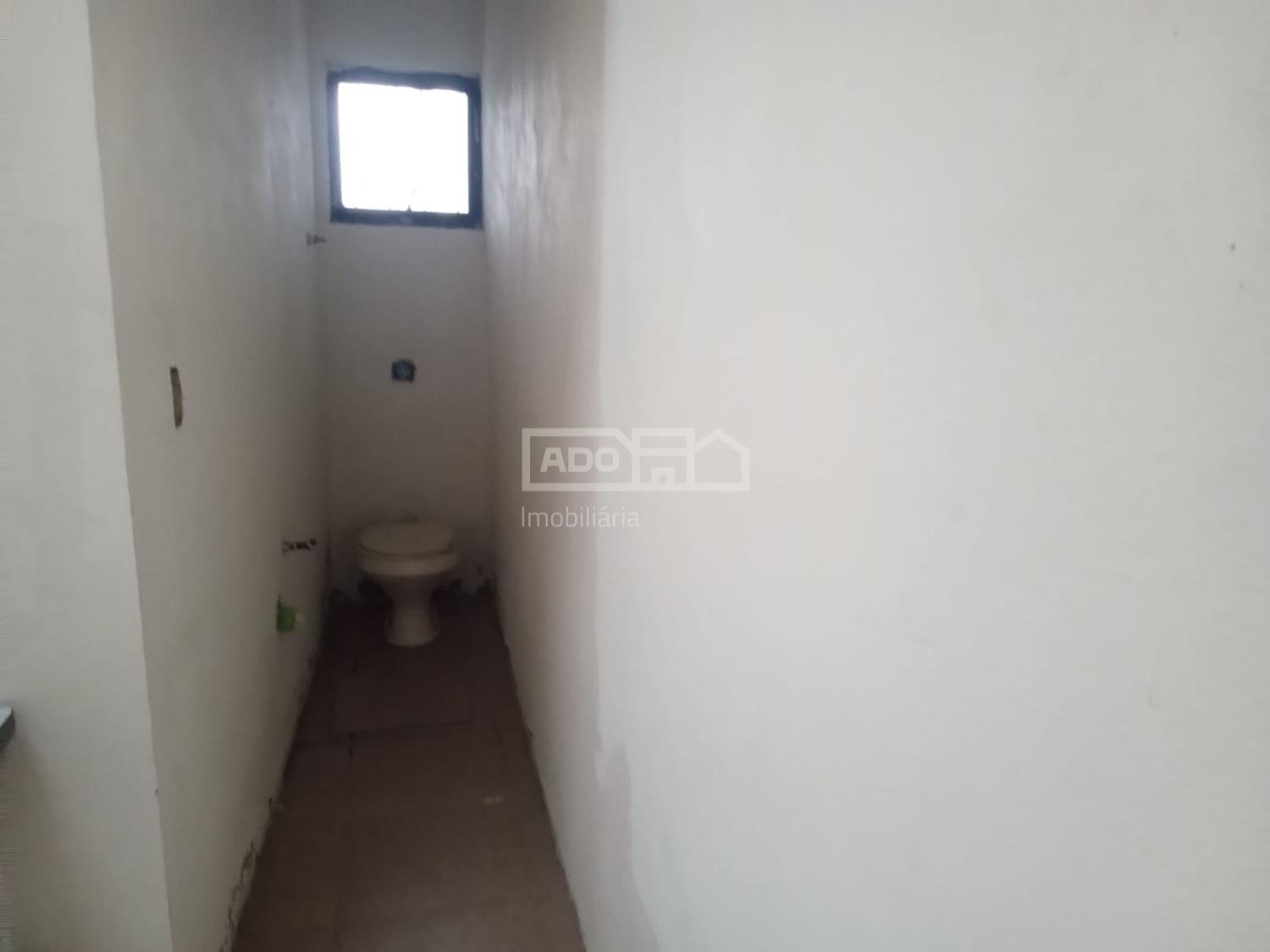 O lavabo também está em fase de finalização, faltando porta e pia (sanitário instalado e paredes prontas, aguardando selador e pintura).
