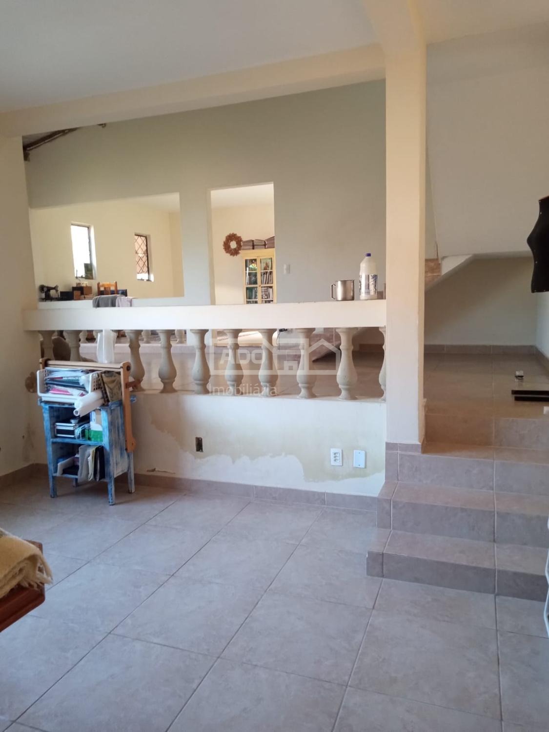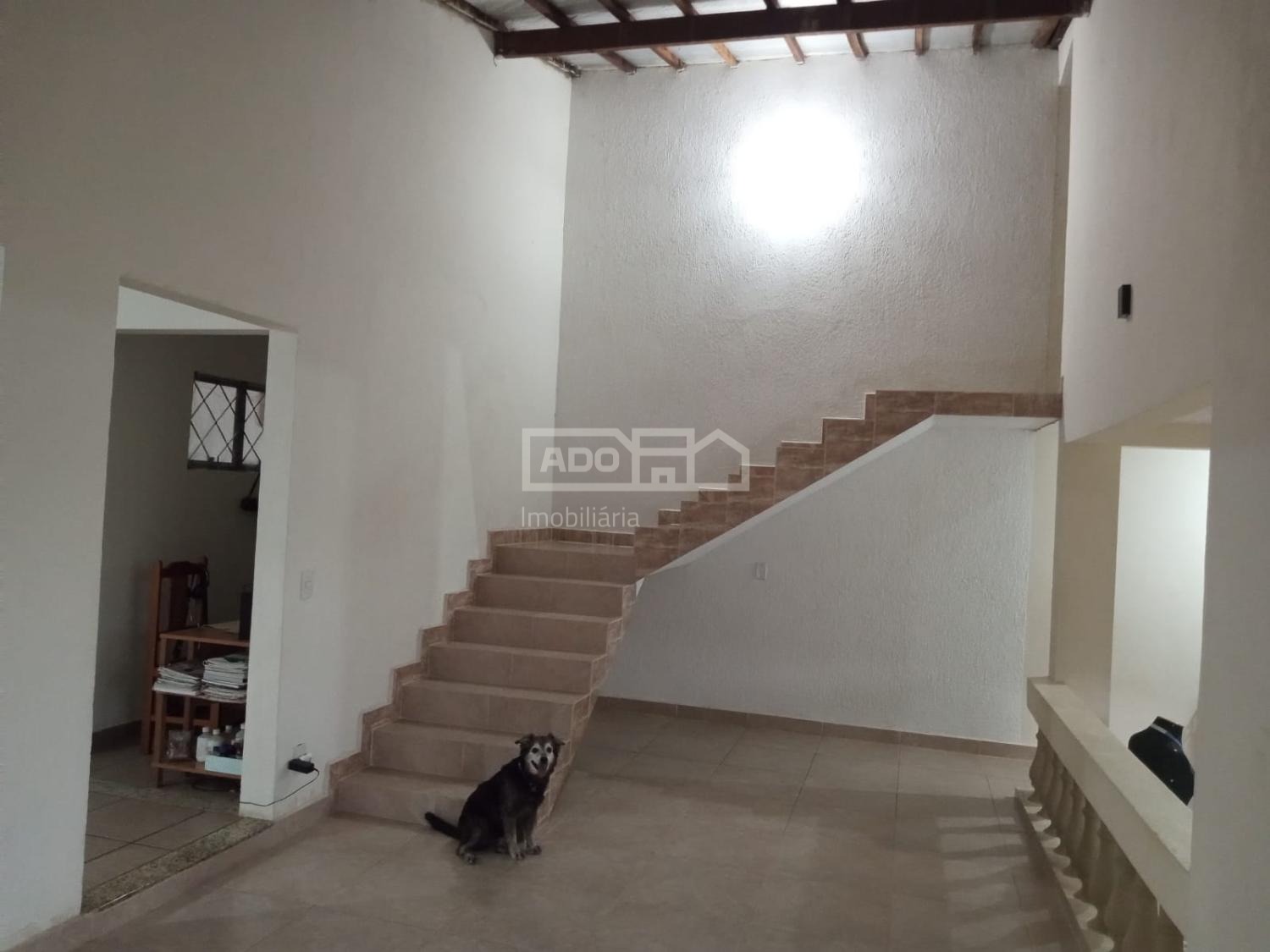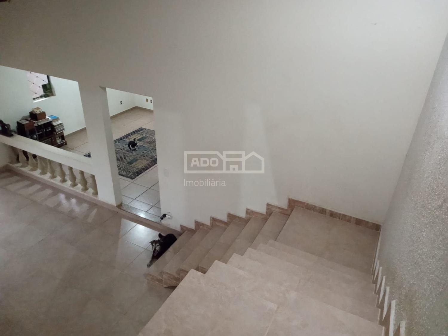 Um degrau leva à sala de circulação, com duas portas de vidro, e uma escada com 12 degraus que dá acesso ao andar superior, onde há: