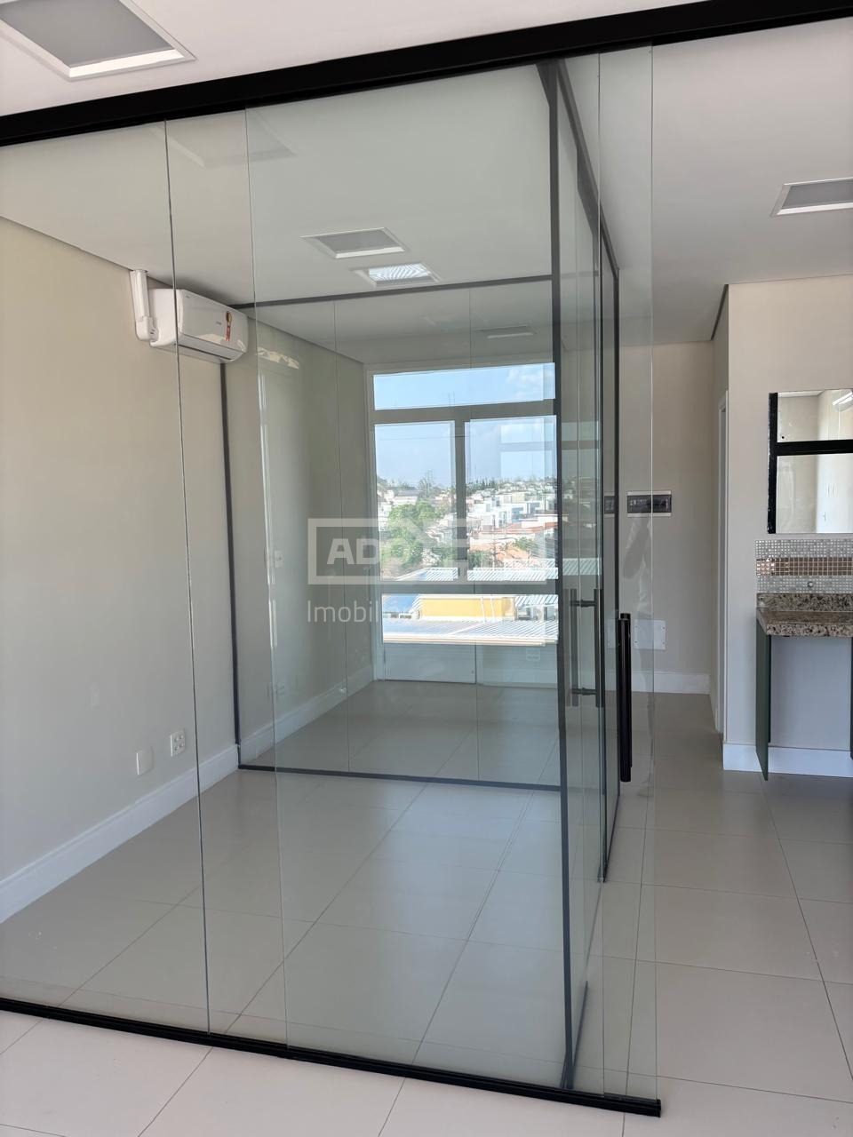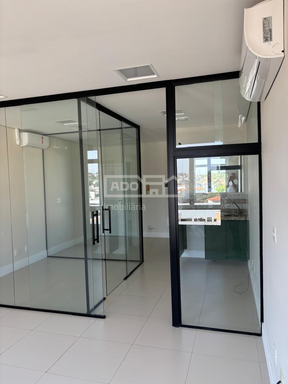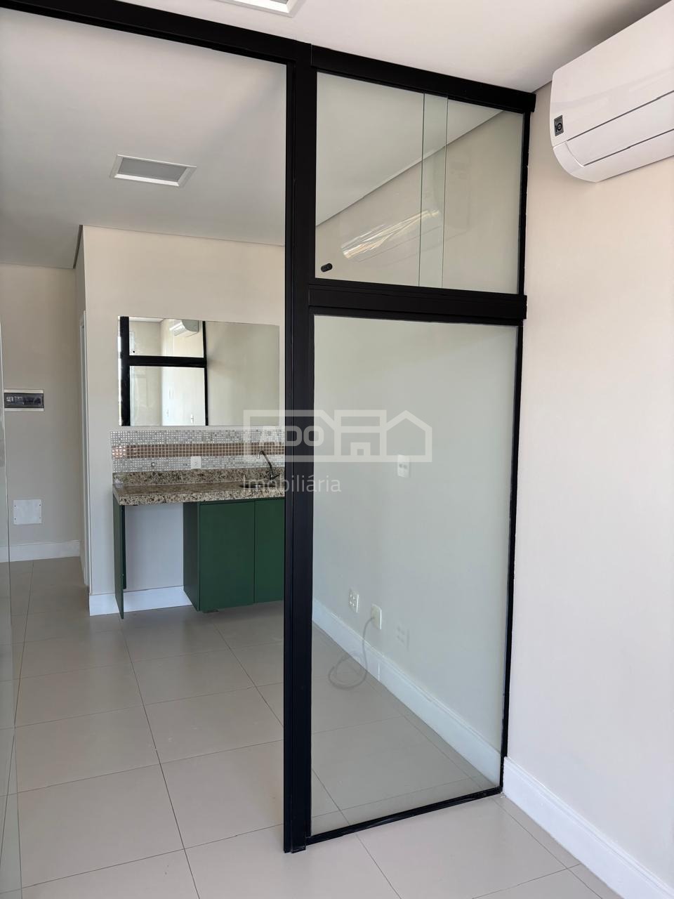 O espaço conta com 39m², distribuídos em três ambientes, acabamento em porcelanato Portobello com rodapé Santa Luzia, teto rebaixado com iluminação indireta, pia de apoio com armário e banheiro privativo.